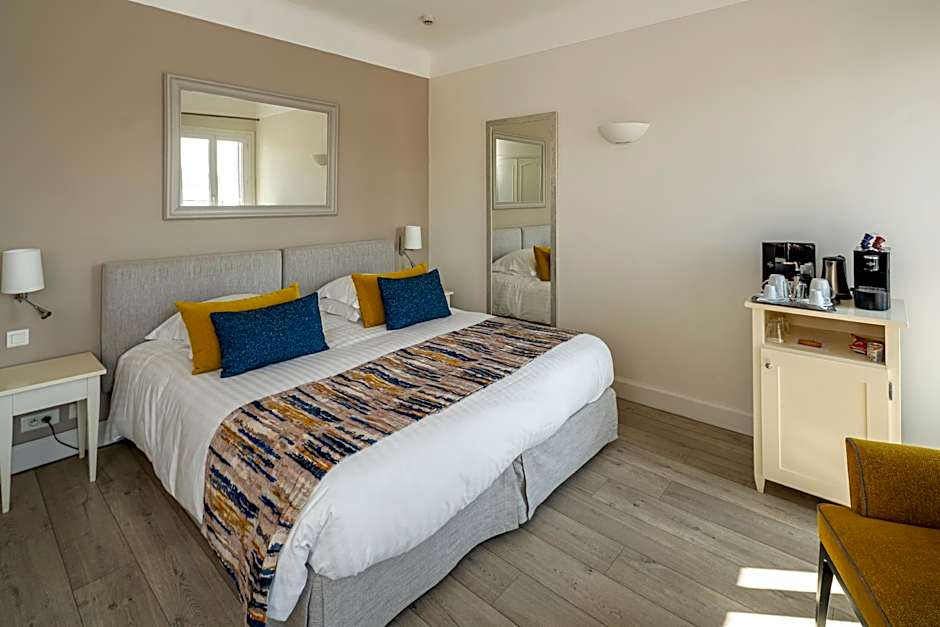 This room includes a flat-screen TV with cable channels, a private bathroom and is decorated in pastel shades. It features a view of the Promenade des Anglais.